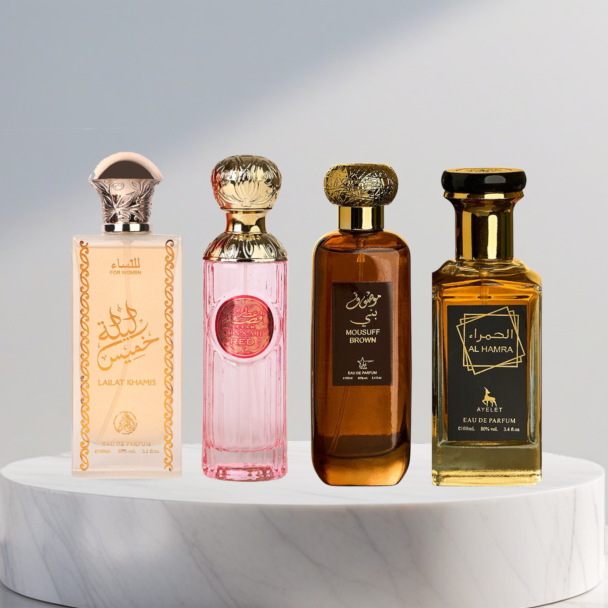Set 4 Parfumuri Arabesti (2x Dama + 2x Barbat) - Lailat Al Khamise + Attar Gissah Red + Mousuff Brown + Al Hamra